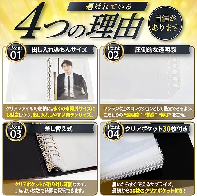 【待望の“差し替え式”クリアファイル収納ホルダー】クリアポケットの容量・透明度・厚み・質感にこだわり抜いた差し替え式のクリアファイル収納ホルダーです!クリアファイルに対応しているので、アイドルコレクションの収納に大人気です♪大切なクリアファイルなどのコレクションを高透明なファイル越しにクリアに眺められちゃいます!程よい厚みとコシもあるのでめくりやすいですよ!