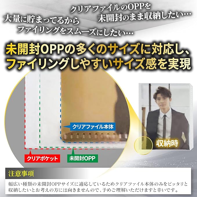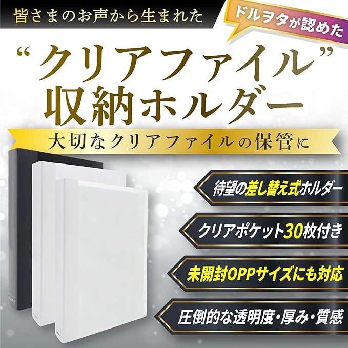 【皆様のお声を形にしました】数多くのお声を元に開発したHMDERYのA4ワイドファイルは、有難いことにAmazonで最も支持をいただく大好評の商品となりました。そして今回の商品も皆様のお声に数多く頂いた「コレクションが増えすぎて収納が大変…クリアファイルを収納したあとに入れ替え、追加したいけど既存のファイルだと差し替え式がない…」その悩みに応えるべく誕生した“差し替え式”クリアファイル収納ホルダーです。 / 今回のクリアファイル収納ホルダーは、こだわりの大きさに調整しているので出し入れ楽チン&多くの未開封OPPサイズに対応しています。もちろん“透明度”や“質感”、“厚さ”まで使いやすさと保管のしやすさにもこだわっているので是非お試しいただけると嬉しいです!
