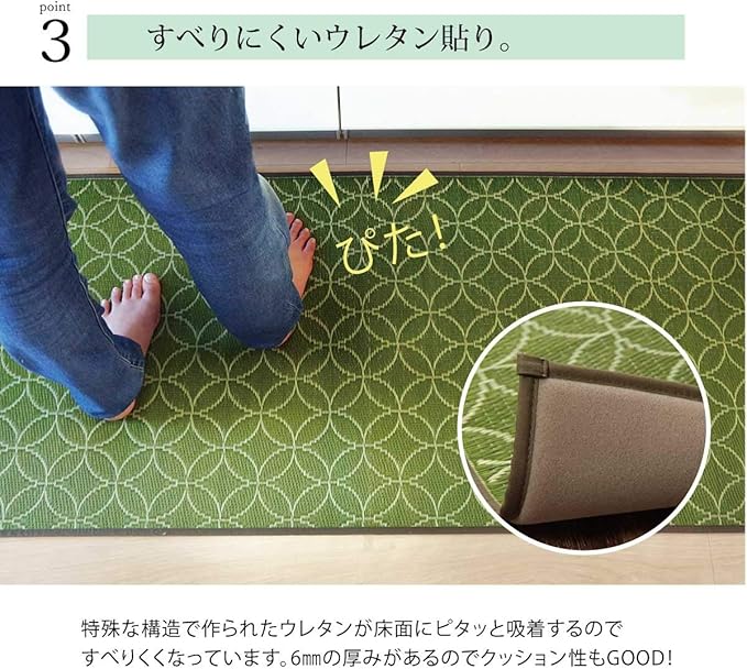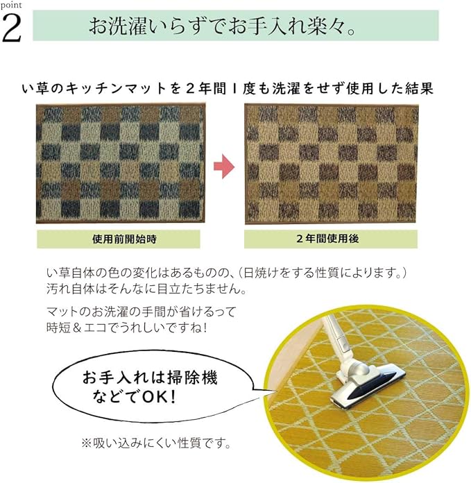洗わなくていい新感覚のい草のキッチンマットです。キッチンマットの不満を解消してくれる商品です。化繊もののキッチンマットと比べ、汚れにくくシミになりにくいです。小さなゴミでも、ほうきで掃く、掃除機をかけるだけで取り除くことができます。い草自体が持つ油分により汚れを弾くので洗う必要がなく長くご使用いただけます。また燃えにくい性質の素材のため火を使うキッチンでも安心してご使用いただけます。今までのキッチンマットへの「洗う手間がかかる」「滑り止めが効きにくい」「お手入れがめんどくさい」などの不満をすべて解消してくれます。い草は畳にも使われている素材のため畳の上に立っているかのような踏み心地を実感していただけます。シンプルな柄とい草の持つ和の雰囲気は日本のお部屋にも合いやすく、またどんなキッチンにもなじみやすい色を揃えました。裏地にはウレタンフォームを使用しクッション性を持たせています。