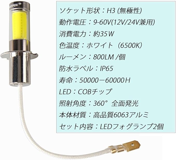 LEDフォグランプ H3 6000k-POOPEE 35W 800LM 12V/24V兼用 無極性 COBチップ360 発光 ホワイト 昼白色 高輝度 2個セット
