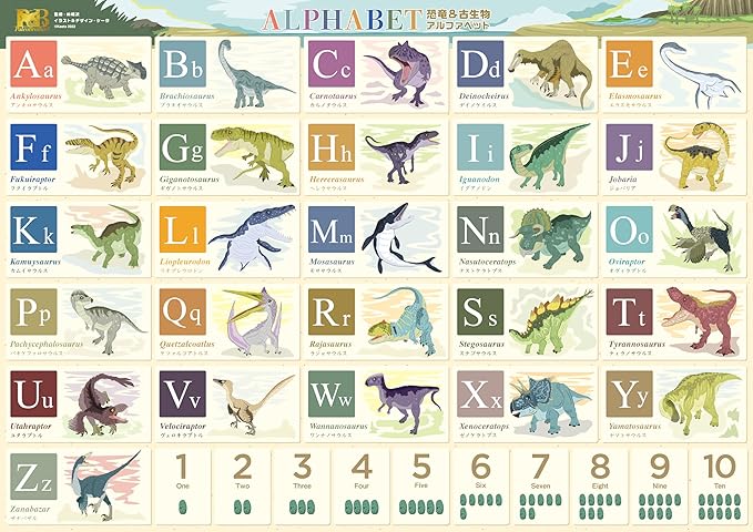 恐竜や古生物と一緒にアルファベットと数字が学べる、A3サイズのお風呂ポスターです。水で濡らすだけで壁に貼れる耐水仕様。AからZまでの各文字にアンキロサウルスなどの恐竜名を起用し、さらに卵のイラストで1から10までの数も数えられます。本格的なイラストが知的好奇心を刺激し、毎日のバスタイムが楽しい英語学習の時間に。恐竜好きなお子様への入学祝いやギフトに最適な、遊びながら学べる実用的な知育アイテムです。