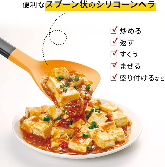 【様々な調理をこの1本で】炒める・煮る・返す・すくう・まぜる・盛り付けるなど、様々な調理に大活躍のスプーンヘラです。便利なスプーン状のヘラ部分はシリコーンのやわらか素材。鍋肌のソースなどもキレイにすくい取れます。※食洗機対応