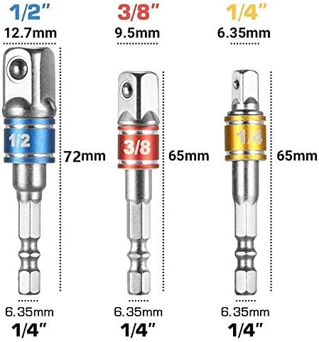 【パッケージ内容】① 差込角3本組:[黄色]6.35mm(1/4″)、[赤色]9.5mm(3/8″)、[青色]12.7mm(1/2″)用 ② 105角度拡張1/4インチの六角ドライバードリルビット1本
