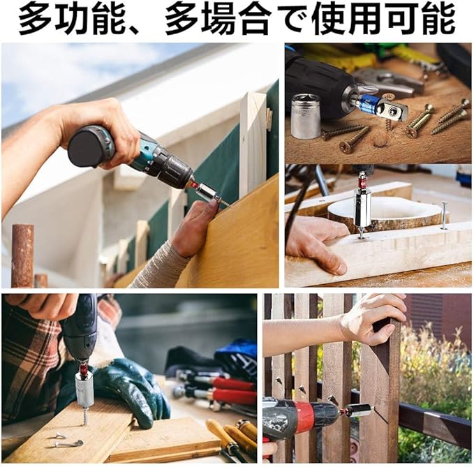 【用途】電動ドライバーで様々な先込み角のソケットを装着し、ボルトやナットの締め外しができます。インパクトドライバー用の首振りソケットアダプターセットです。壁際や狭所等の作業環境に最適です。クラッチ機構の付いた充電式電動ドリルでも利用できます。