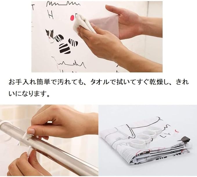 ★【防水防カビ加工】:PEVA材料を採用、防水防カビ効果がよい、いつでも衛生的で清潔に保つ、柔らかくて肌触りよい、いつもバスタイムが快適になります。お手入れ簡単で汚れても、タオルで拭いてすぐ乾燥し、きれいになります。