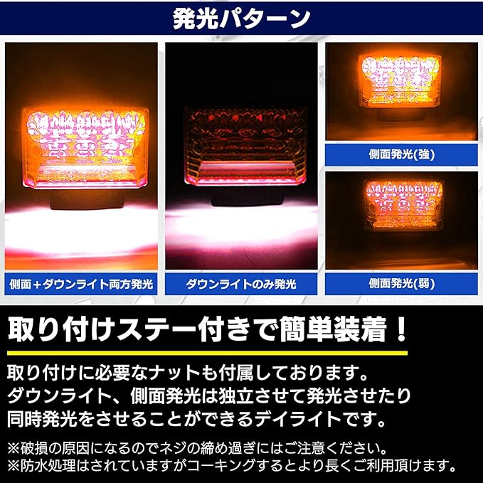 汎用タイプでダウンライト付き、デイライトとしてもご使用いただける高輝度(COB)LEDサイドマーカーになります! DC24Vに対応しているので大型車やトラックにも取り付けでき、明るいランプなので路肩灯や夜間の車幅確認で大活躍です! カラーバリエーションも豊富なのでトラック、ローリー、トレーラー、バス、デコトラなど様々な車種のカスタムやドレスアップ用の社外アイテムとしてもオススメです。 防水処理はされていますがコーキングするとより長くご利用頂けます。 ※破損の原因になるのでネジの締め過ぎにはご注意ください。 【配線】 黒=アース 赤=ダウンライト (ホワイト) 白=弱点灯 (ブルー) 黄=強点灯 (ブルー) ダウンライト、 側面発光は独立させて発光させたり同時発光をさせることができます! ※配線が3色の場合は、黒=アース、黄=ダウンライト、赤=サイドマーカー、になります。 【付属品】 本体、 取付けステー、ボルト、ナット ※10個セットと4個セットをご用意しているので、ご希望の個数をバリエーションからお選びください。 【側面発光カラー】 ホワイト(クリア)/オレンジ/ブルー/グリーン ※アンダー(ダウン)ライトはホワイトになります。
