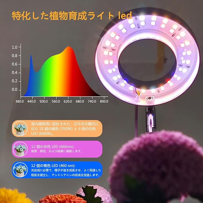 【太陽の光のような全光スペクトル・日照不足解決】50W光源-48個LEDの組み合わせて、この植物育成ライトは380nmから800nmまでの光束提供するため、 植物の育成状況や種類に合わせてぴったりな波長の光を照射することができるのでおすすめです。
