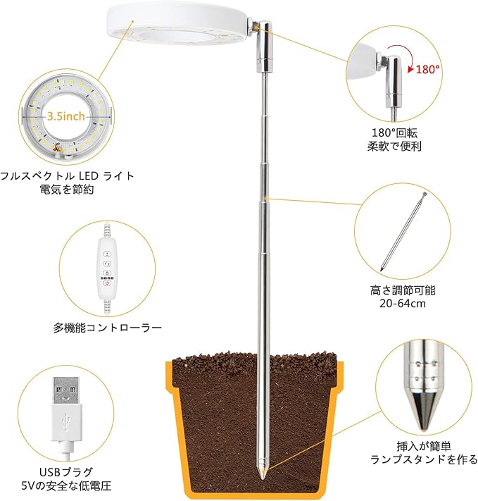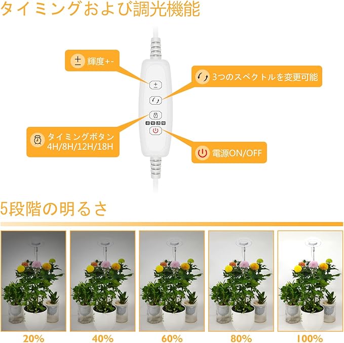 【サイクルタイミング機能】サイクルタイミング機能:4時間、8時間、12時間または18時間の4つの時間設定モードは、異なる植物のニーズに応じてあります。4時間、8時間、12時間または12時間に設定した場合でも、植物育成LEDライトが自動的に4時間、8時間、12時間または12時間後に消えます。その後、翌日に手動でライトをオンにする必要はありません。 このグローライトはメモリ機能を有し、24時間後に自動的にオンになります。 タイマーモードをオフにすると、すべての設定がオフになります。