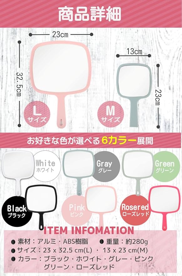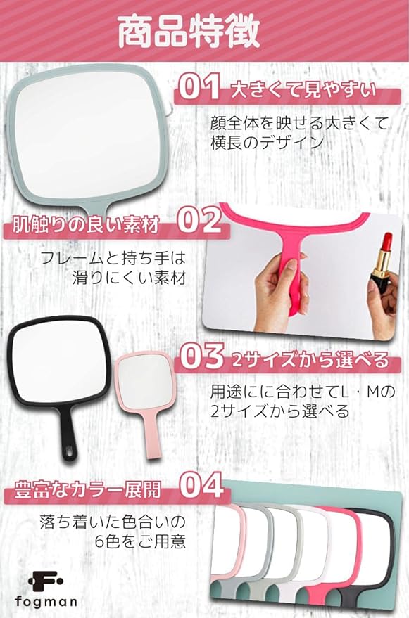 【商品特徴】 大きくて見やすい:顔全体を映せる大きくて横長のデザイン 肌触りの良い素材:フレームと持ち手は滑りにくい素材 2サイズから選べる:用途にに合わせてL・Mの2サイズから選べる 豊富なカラー展開:落ち着いた色合いの6色をご用意