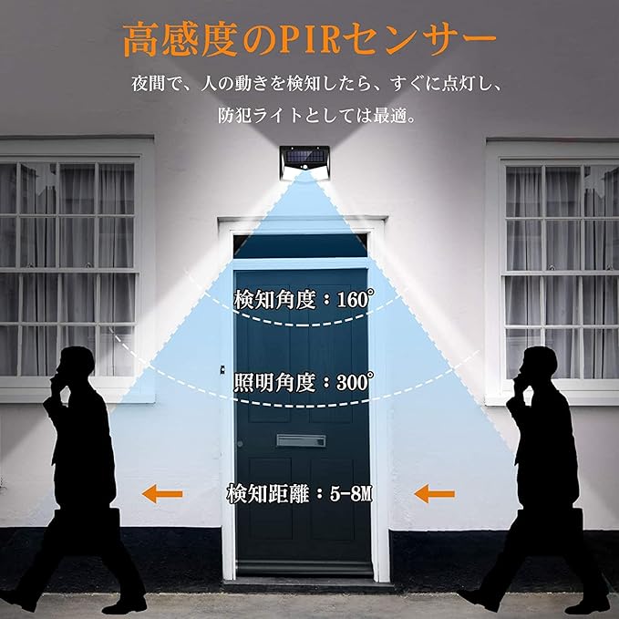 【3つ知能モード・光&人感センサーライト・自動点灯消灯】3つの点灯モードとは常時点灯モード、DIMセンサーモード、人感センサーモードで、場合によって異なるモードを設定できます。3つのモードとも昼間と明るい場所では点灯しません。【常時点灯モード】夜または暗くなると、電量が0になるまでずっと低輝度で点灯します。【DIMモード】夜や暗くなると、自動的に弱光点灯します。検知範囲以内には人や動物が来ると、自動的に高輝度点灯になって、動きがなくなると約15秒後弱い光で点灯状態に戻ります。【センサーモード】夜や暗くなると、普通は点灯しません。人や動物の動きを感知すると、自動的に自動的に高輝度点灯になって、動きがなくなると約15秒後消灯になります。