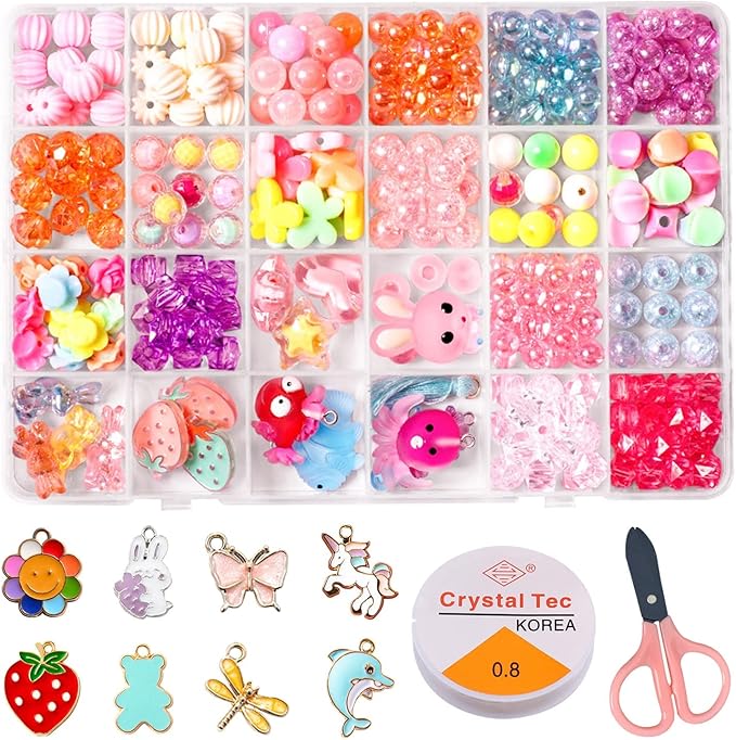「種類豊富ビーズキット」ベース形のビーズのほか、大きめかわいい動物形のビーズも用意しております。さらに13M長さのテグスとミニハサミも付属し、アクセサリーキットなど種類がとても豊富です。
