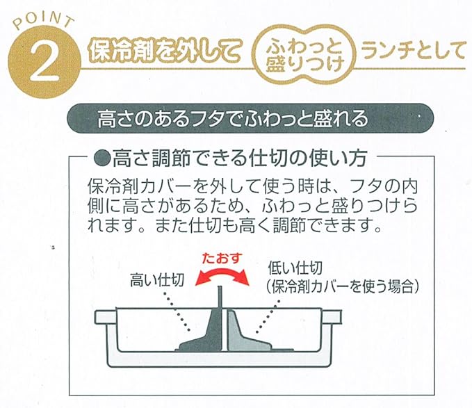 保冷剤を外してふわっと盛り付け!フタの内側に高さがあるのでふわっと盛り付け、仕切は高さ調節できるので便利
