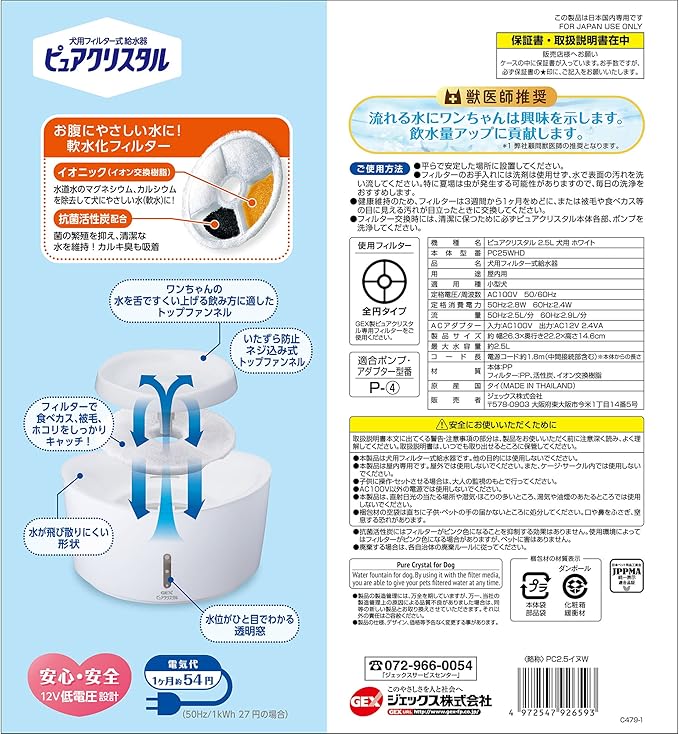 ・平らで安定した場所に設置してください。 ・フィルターのお手入れには洗剤は使用せず、水で表面の汚れを洗い流してください。特に夏場は虫が発生する可能性がありますので、毎日の洗浄をおすすめします。 ・健康維持のため、フィルターは3週間から1ヶ月をめどに、または被毛や食べカス等の目に見える汚れが目立ったときに交換してください。 ・フィルター交換時には、清潔に保つために必ずピュアクリスタル本体各部、ポンプを洗浄してください。 ・適合ポンプ・アダプター型番:P-4/使用フィルター:正円タイプ 続きを見る