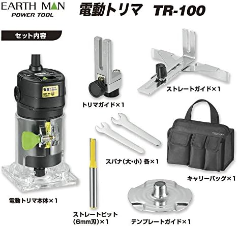 セット内容:電動トリマ本体 1、トリマガイド 1、ストレートガイド 1、テンプレートガイド 1、スパナ(大・小) 1、ストレートビット(6mm刃) 1、キャリーバッグ 1