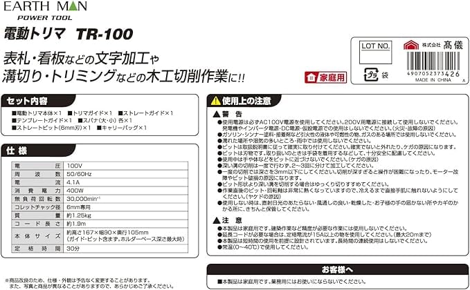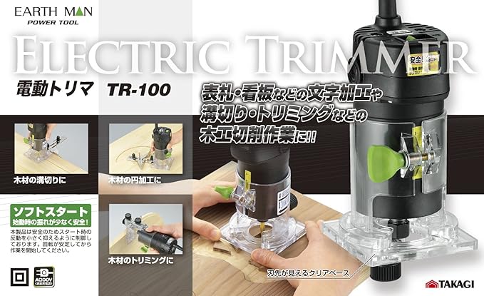 高儀(Takagi) 電動トリマ コード付き EARTH MAN TR-100【ソフトスタートにより始動時の振れが少ない】 トリマー 電動工具 電動トリマー DIY 電動カンナ