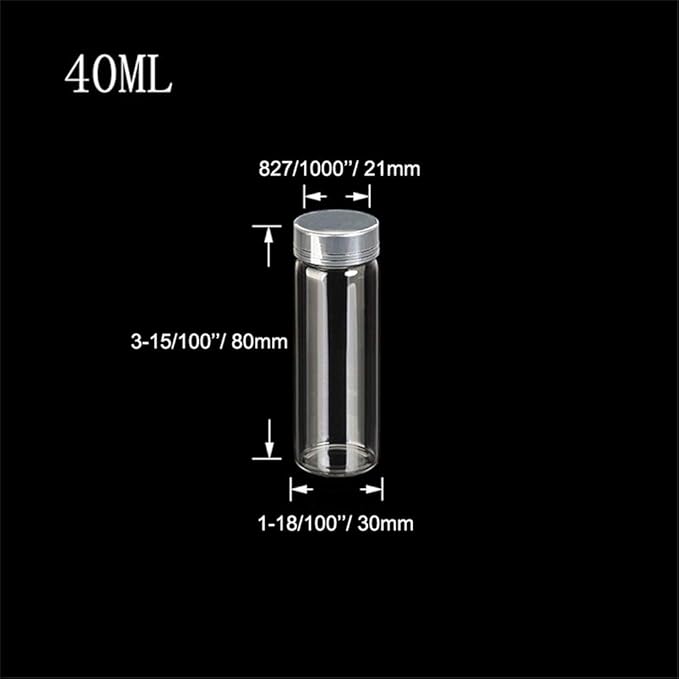 容量は40ml、外径は30 mm、高さは80 mm、開口21 mm,透明なガラス瓶と銀の明るい面のアルミ蓋で構成されています。, アルミの蓋の内部には白いプラスチックの底があります。