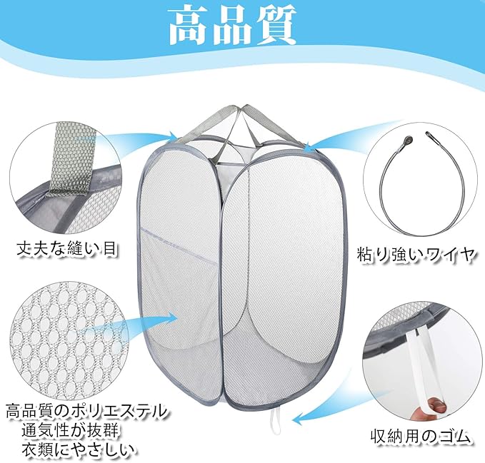 【折りたたみデザイン、幅広く利用でき】誰でも、簡単に利用でき、開ける瞬間、サッと組立完了!洗濯カゴとして、主な機能は衣類などの収納ですが、大容量でごみ箱にもなれ、不要な新聞紙や雑誌などを収納できます。また、ランドリーバッグの表面はメッシュ加工で一定の通気性があると思われ、日差しがあれば、物を干すこともできますよ、メッシュ加工ですから、隙がたっぷりと思います!