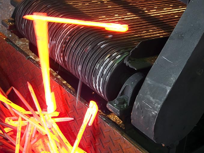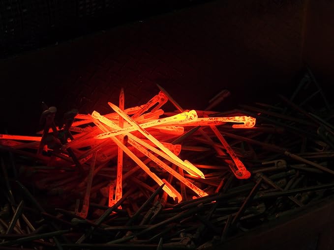 素材の丸い鋼材を約1100℃になるまで真っ赤に熱し、約1トンという強力な力で一気に断面を楕円形に潰した鍛造ペグ。熱した鋼材に強力な圧力を加えることによって、優れた強度を持つペグが完成します。