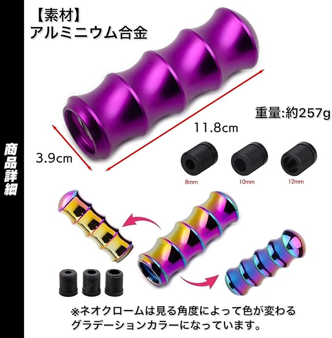 【カラー】 ネオクローム、クローム、シルバー、グレー、ブラック、パープル、レッド 7色展開なのでお車の雰囲気に合わせてJDMやUSDM仕様などのカスタム、ドレスアップ用のパーツとしてもお楽しみ下さい。 【サイズ】 長さ : 11.8cm 直径 : 3.9cm 重さ : 約260g