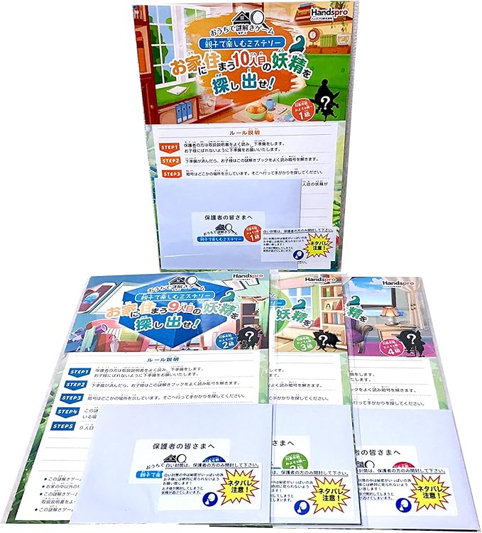 遊び方 STEP1:保護者の方は白い封筒を開けて、手がかり1〜3を指定の場所に隠します。 STEP2:お子様は謎解きブックの3つの暗号から手がかり1〜3が自宅のどこにあるかを推理し探します。 STEP3:手がかりが3つ見つかったら妖精の居場所が推理できるので妖精の居場所を探します。 STEP4:妖精カードが見つかったらミッションクリア! 外出制限がある中でも自宅で楽しい時間を過ごせます。 大人から子供まで同じ目線で楽しめます。 保護者の方が仕掛け人になるので、お子さんとの自然なコミュニケーションが生まれます。 頭を使う問題だから、楽しくゲーム感覚で学べます。 長時間スマホゲーム、動画を見すぎてしまう・・・などのお悩み解決に!