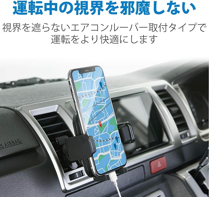 スマートフォンを車内に設置できる、エアコンルーバー取付タイプの車載ホルダーです。