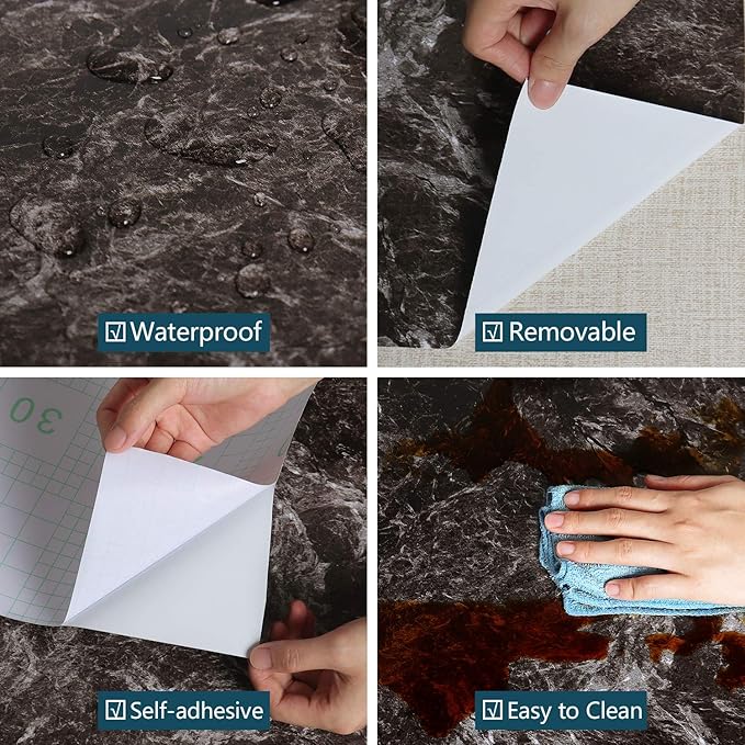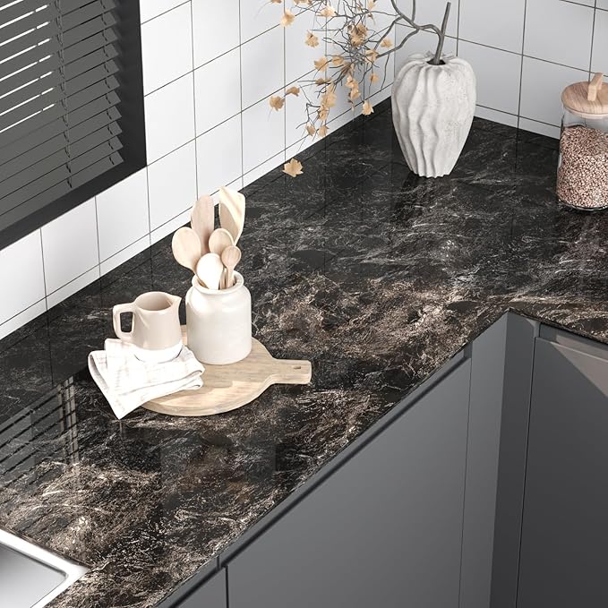 ⭐【ウォールステッカーのサイズ】:40cmx600cm 貼り付け説明書付き 色:大理石柄 ブラック。素材:高品質PVC(ポリ塩化ビニル)。表面は防水加工が施して水などがこぼれてもキレイに拭き、簡単お手入れ。裏面は目盛り付きでお好きな長さにカッティングして活用できます。また貼り直す可能、一度失敗しても剥がして貼り直せばOK。DIY初心者の方でもお気軽にお試しいただけます。