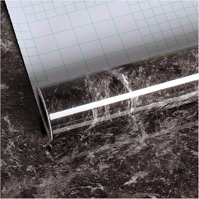 VEELIKE大理石シートリメイクシート大理石調 黒 光沢有り 壁紙シール リフォームシート40cmx6m カッティングシート ウォールステッカー 接着剤付き 防水 耐熱 防汚 防油 防カビ 厚手 おしゃれ 洋風 模様替え キッチンシート DIYインテリアシール 賃貸OK 家具保護 台所 補修シール ブラック 石目調