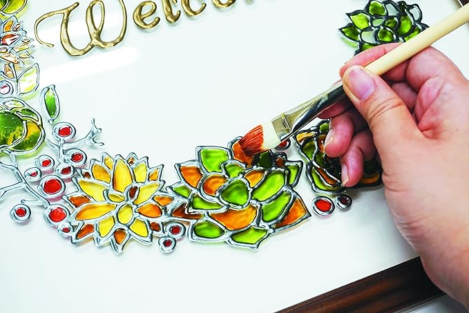 ガラスペイントはガラスに直接塗れる透明感のある水性ペイントです。ガラスや瓶などガラス製品のリメイクに最適です。バリエーションはアンティーク調のカラーを中心とした9色と曇りガラス調が表現できる「曇り」、表面に気泡が表現できる「泡玉」、上塗りすることで塗膜のべたつきを抑える「専用クリア」の12種類をご用意しています。やわらかい毛の筆やスポンジで塗れ、乾燥後にはガラスにしっかりと密着し、多少の水がかかる程度でははがれません。ライナーと組み合わせることでステンドグラスのような作品が作れます。