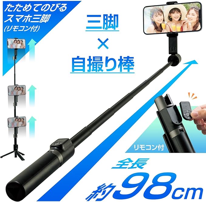 コモライフ たためてのびる スマホ三脚 (リモコン付) スマホスタンド 自撮り棒 三脚 セルカ棒 iPhone Android