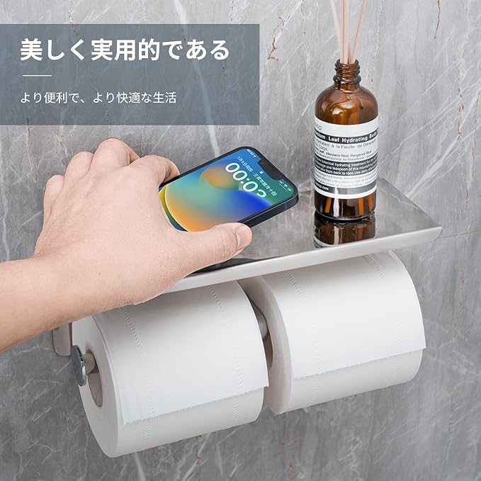 棚付紙巻器:手を解放し、携帯電話やタバコ、身の回り品が置く場所がない心配は不要。電話などの貴重品の収納にも使える。