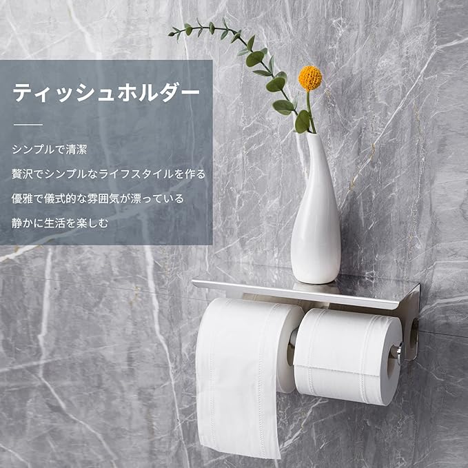 紙巻器 2連 棚付紙巻器 トイレットペーパーホルダー ペーパータオルホルダー 304ステンレス製 ロールホルダー 壁掛け トイレ用 小物置き 紙巻器 簡単設置 (シルバー)