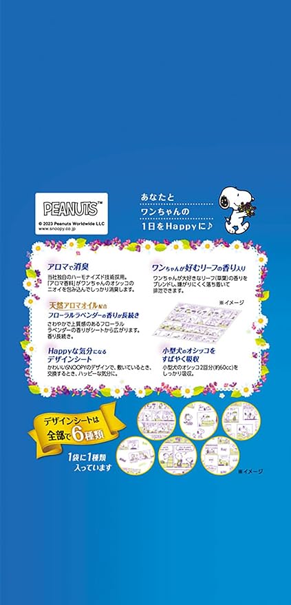 小型犬のオシッコをすばやく吸収。天然アロマオイル配合のフローラルラベンダーの香りでしっかり消臭し、香り長続き。ワンちゃんが好むリーフの香り入り。かわいいSNOOPYのデザインシートで、敷いているとき、交換するとき、ハッピーな気分に。<レギュラーサイズ> 45 33cm