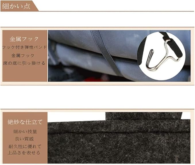 【二重固定】取り付けはとても簡単で、助手席のヘッドレストの下に吊るすだけですが、緊急ブレーキをかけると、収納物が捨てられて後列の人を傷つける可能性がありますので、助手席の底に固定する金属製のフック付きゴムベルトを追加して、フックを助手席の底に固定して、これで二重固定、非常に安定しています。