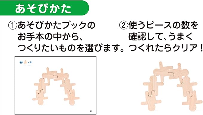 全50パターンの見本が載ったあそびかたブックを見て同じようにつくったり、ならべてドミノ倒しをしたり、子どもの年齢に合わせたあそびかたができ、集中力・創造力・空間認知力・手の巧緻性などの能力が身につきます。