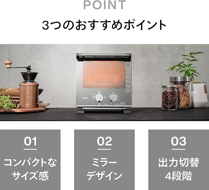 【ミラーガラスでデザインも機能もスタイリッシュに。】使っているときだけ庫内が見える、スタイリッシュなトースター。 リビングからも見える場所に置くなら、家電にもデザイン性を求めたい。そんな声から生まれたツインバードのミラーガラスシリーズ。使っているときだけ庫内が見える仕様。使わないときは、インテリアとしての美しさを漂わす。細部にまでこだわってリニューアルを重ねてきました。