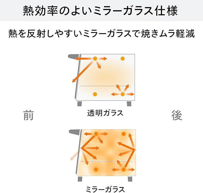 【ミラーガラスで 外サクッ、中ふんわり。】熱を反射するミラーガラスを使用することで、ムラなく熱を行き届けることが可能に。 パンの水分が逃げるのを防ぎ、スピーディーにすばやく焼き上げます。