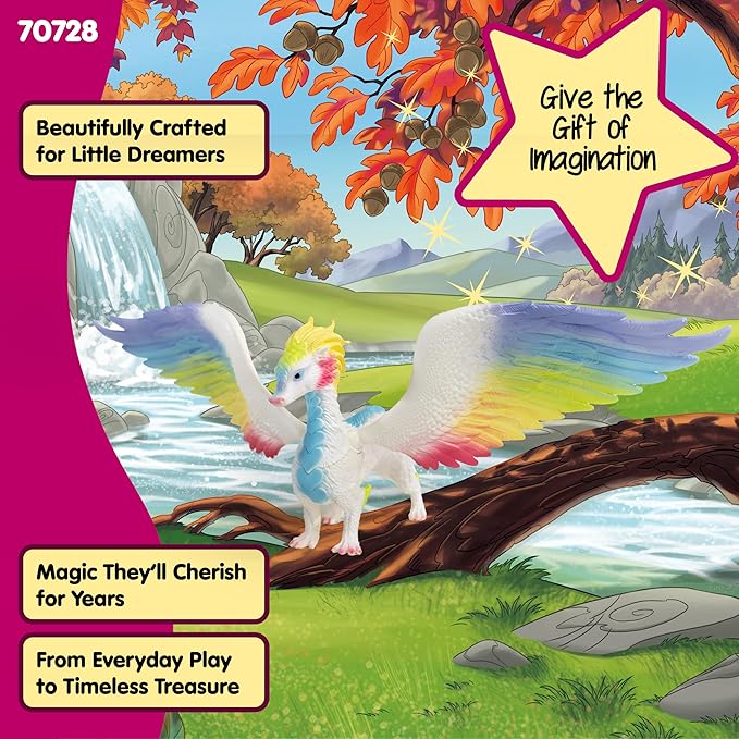 商品紹介 【シュライヒについて】1935年創立のシュライヒ社は、ドイツ最大手のおもちゃ会社の一つで世界屈指のフィギュアメーカーです。シュライヒフィギュアは世界60カ国以上で販売されており、リアルに再現された精巧な製品は、世界中の子どもたちに愛されています。【商品について】レインボードラゴンを捕まえたら、しっかりとつかまってください。大きくてカラフルな翼で、雲の切れ間から太陽の光が差し込むように、上空へと舞い上がります。 安全警告 CHOKING HAZARD