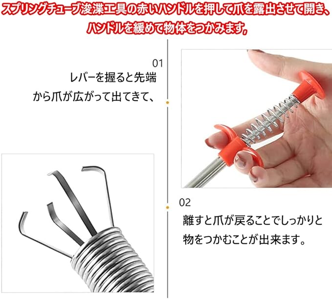 【操作も簡単】スプリングチューブ浚渫工具の赤いハンドルを押して爪を露出させて開き、ハンドルを緩めて物体をつかみます,時間と労力を節約し、操作が簡単です。