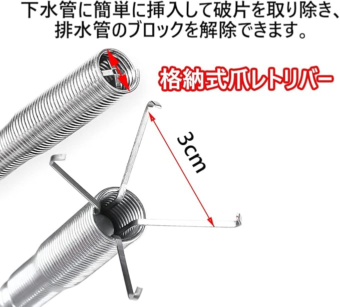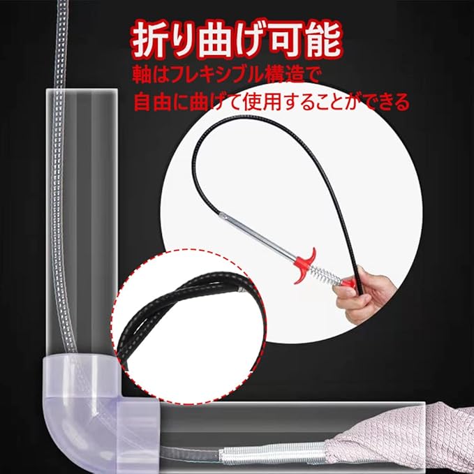 【細長い】パイプクリーナー 長さ160 cm、長くて細い構造で、狭い所でも心配なく清潔できます。柔軟で折り曲げ可能な巻き上げ式スプリング付きケーブル,下水管に簡単に挿入して破片を取り除き、排水管のブロックを解除できます。