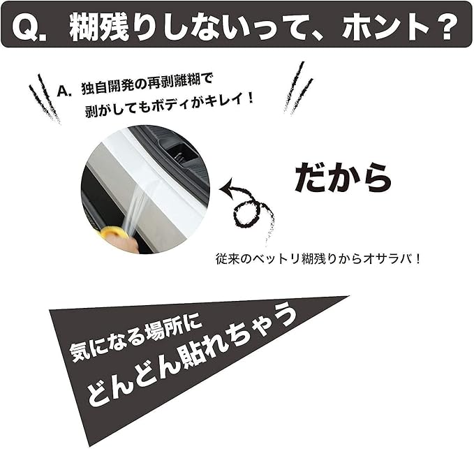 【注意事項】 本製品は自動車の一般塗装面用に設計されています。樹脂部のシボ加工など、特殊な表面処理が施された箇所には、貼付かない場合や、一時的に貼付いても数日後に剥がれる恐れがあります。事前に切れ端などで確認の上、ご使用ください。