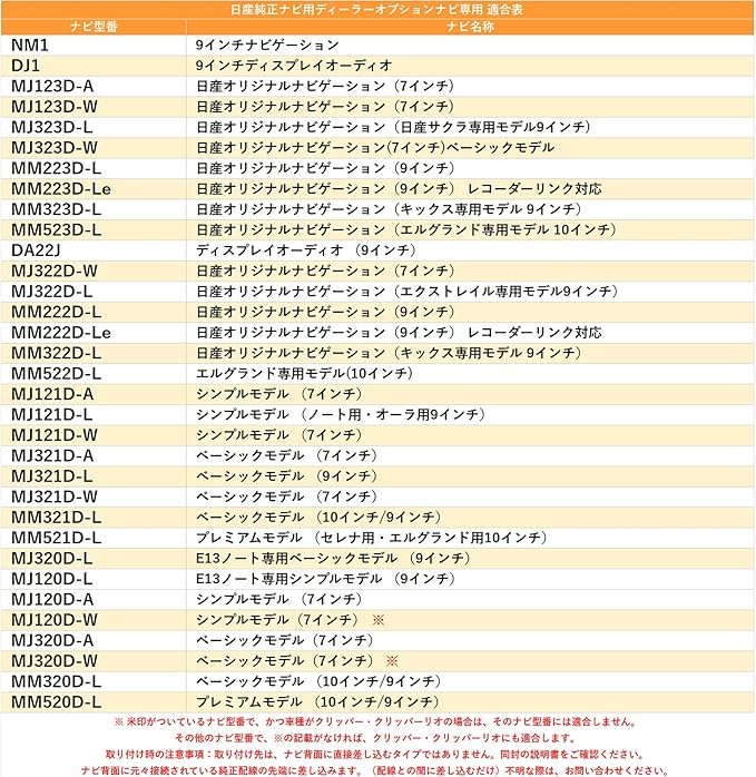 2020年モデル MJ320D-LE13ノート専用ベーシックモデル (9インチ) MJ120D-LE13ノート専用シンプルモデル (9インチ) MJ120D-Aシンプルモデル (7インチ) MJ120D-Wシンプルモデル(7インチ) ※ MJ320D-Aベーシックモデル(7インチ) MJ320D-Wベーシックモデル(7インチ) ※ MM320D-Lベーシックモデル (セレナ用10インチ/エクストレイル・デイズ・ルークス・キックス用9インチ) MM520D-Lプレミアムモデル (セレナ用10インチ/エクストレイル用9インチ) 2019年モデル MJ119D-Aシンプルナビ 7インチ ※ MJ119D-Wシンプルナビ 7インチワイド ※ MM319D-Aベーシックナビ 7インチ MM319D-Lベーシックナビ (セレナ用10インチ/エクストレイル・デイズ用9インチ) MM319D-Wベーシックナビ 7インチワイド ※ MM519D-Lプレミアムナビ (セレナ用10インチ/エクストレイル用9インチ/エルグランド用8インチ)