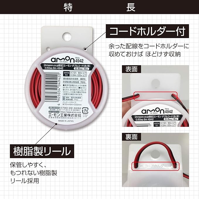 各種電装品取り付け時の配線に ・耐熱、耐油、対衝撃、難燃性に優れています ・保管しやすく、もつれない樹脂製リール採用 ・コードホルダー付で余ったコードをスッキリ収納
