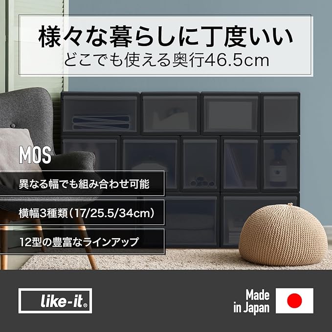 ライクイット (like-it) 衣装ケース 引き出し クローゼット リビング 洗面所 メタルラックにピッタリ 奥行き約46.5cm 日本製 組み合わせて使える 収納ケース ミディM グレー MOS-02