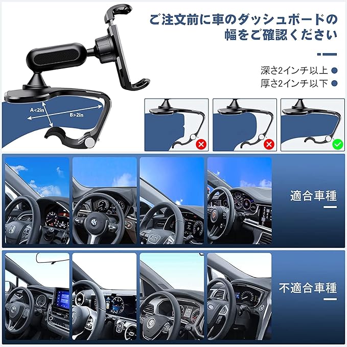 1.「着脱簡単*クリップ式」ダッシュボードでもサンバイザーでも任意な位置に取り付けが可能です。360度回転の首振ることができる機能のため、ニーズに応じてスマホの水平画面と垂直画面を自由に切り替えます。充電口をふさがない構造なので、充電しながら使用できます。 実用性とシンプルな使用感を求める方に適しています。ご注意:Eatfcae JP Store からご注文してください