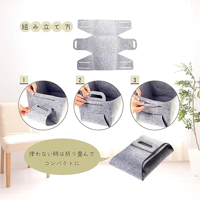 丈夫で軽く、滑りにくいフェルト素材で作られていて、中のものを引きだしてもずれずに持ち上げやすい! また底部分も段ボールのように抜けることが無いので持ち運びや移動にも安心。大満足の頑丈さを持っています。