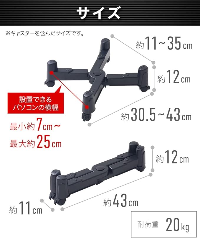【サイズ調整可能】 最大25cmまでの幅広いサイズに対応。 機器の横幅に合わせて調整できるので、 省スペースPCからサーバーまで幅広くご活用いただけます。 未使用時はコンパクトに収納できます。 ※キャスターを外せば更にコンパクト!