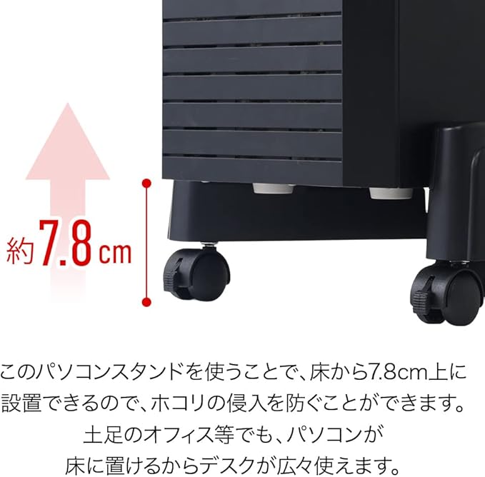 【ホコリの侵入防止に】 パソコンを床に直接置くと、内部にホコリが入りやすく、故障の原因になる場合があります。 このパソコンスタンドを使うことで、床から7.8cm上に設置できるのでホコリの侵入を防ぐことができます。 土足のオフィス等でも、パソコンが床に置けるからデスクが広々使えます。 【滑り止めゴム&サポートで安心】 スタンドとPC本体が接しても傷つきにくくするため、滑り止めパッドが底面に付いています。 また、四隅のサポートで、スタンドからパソコンが落下するのを防ぎます。
