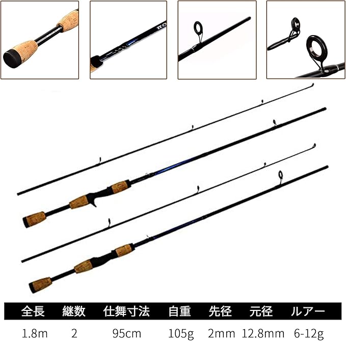 【商品仕様】:タイプ:スピニングリール & ベイトリール 素材:炭素繊維&木製 カラー:クロ 自重:104g 全長:180 cm 仕舞寸法:95 cm 継数(本):2 先径:2.5mm / 元径:12.8mm