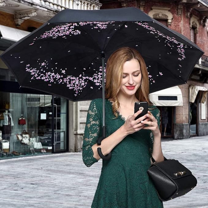 二重構造+親骨8本=丈夫なデザイン。厚くする設計したC型手元、両手解放できる逆さ傘。