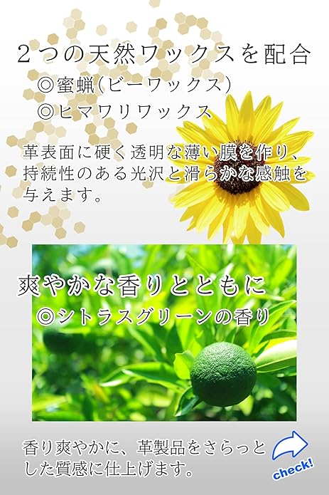 天然ワックスのビーズワックスとヒマワリワックスが皮革表面に硬く透明な薄い膜を作ることで、持続性のある光沢と柔らかな感触を与えます。保湿効果に優れたホホバオイルが皮革に素早く浸透し、繊維間の摩擦を減少させることで皮革にしなやかさと柔軟性を与えます。クリームをソフトジェルタイプにしましたので、皮革表面に薄くムラなく塗り伸ばすことができます。有機溶剤を使用していません。皮革にやさしい中性タイプです。シトラスグリーンの香りが心地良い、べたつかない皮革用クリームです。 シミや色落ちする革もあります。目立たない部分で試してからご使用下さい。スエード、ヌバックなどの起毛革、ヘビ・ワニ革、その他特殊な革や布製品には使用できません。